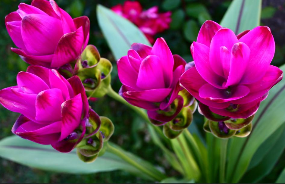 Куркума – многолетник, вырастающий до 1 метра в высоту. Наземная часть вырастает из почки корневища. Состоит она из нескольких длинночерешковых листьев и цветоноса (до 30 см в длину), плотно усаженного зелеными прилистниками, немного осветленными на концах.