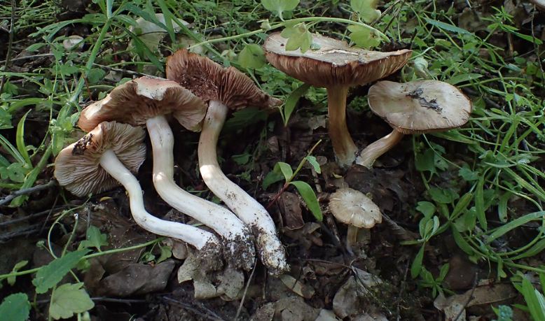 - Энтолома бледно-коричневая. Съедобный гриб, произрастающий с мая по июнь в зарослях кустарников, огородах и газонах. Шляпка имеет коричнево-серую окраску или буроватую с зеленым отливом. Пластинки выемчато-нисходящие. Ножка длинноволокнистая, блестящая, белого цвета.