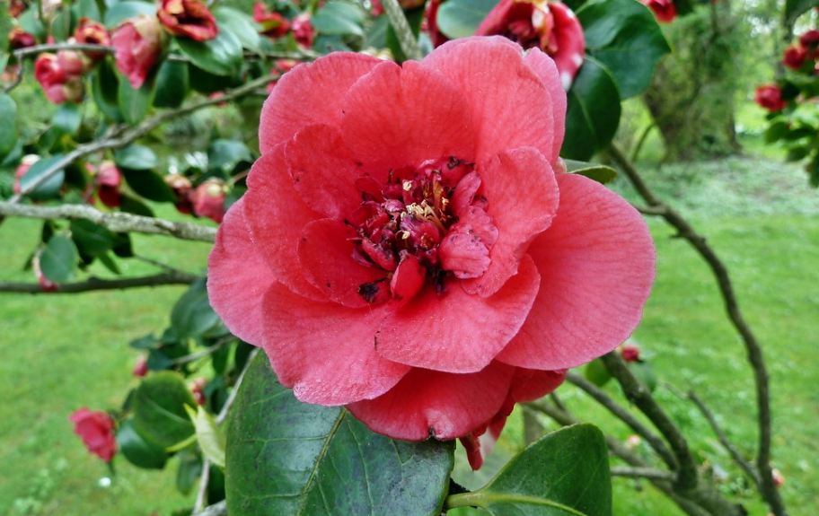 - Камелия горная или Сасанква – раскидистые вечнозеленые кустарники с мелкими красивыми листьями и некрупными пятилепестковыми цветами, склоненные ветви которых имеют длину до 4,5-5 метров.
